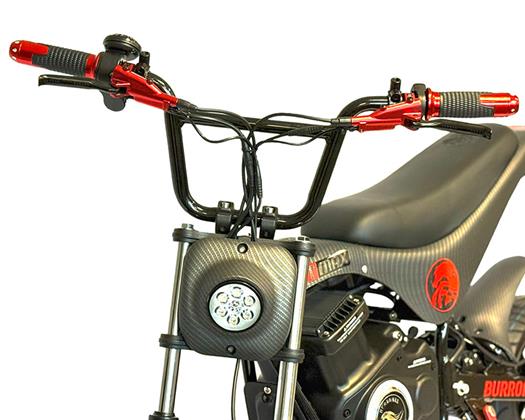 Everything you love about the TT1000R with an upgraded 1500w (1.5kW) 6000 rpm motor capable of achieving top speeds of 34 mph. A new more comfortable high-loft seat was added to improve overall comfort, along with new street 90/65.8 supermoto tires and our new anodized billet aluminum kick stand. When you got a lot of GO you need a lot of WHOA, so new anodized billet aluminum hydraulic front and rear brakes were added to help bring this speed monster to a stop. The TTMAX is the ultimate electric mini bike to get around the pits or have a blast around the neighborhood.